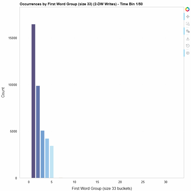 The animated histogram below shows how the distribution of first-word values in 2-dword posted writes evolves over the life of the trace. Each colored bar is one 33-value bucket; the y-axis is occurrence count within the sliding window.